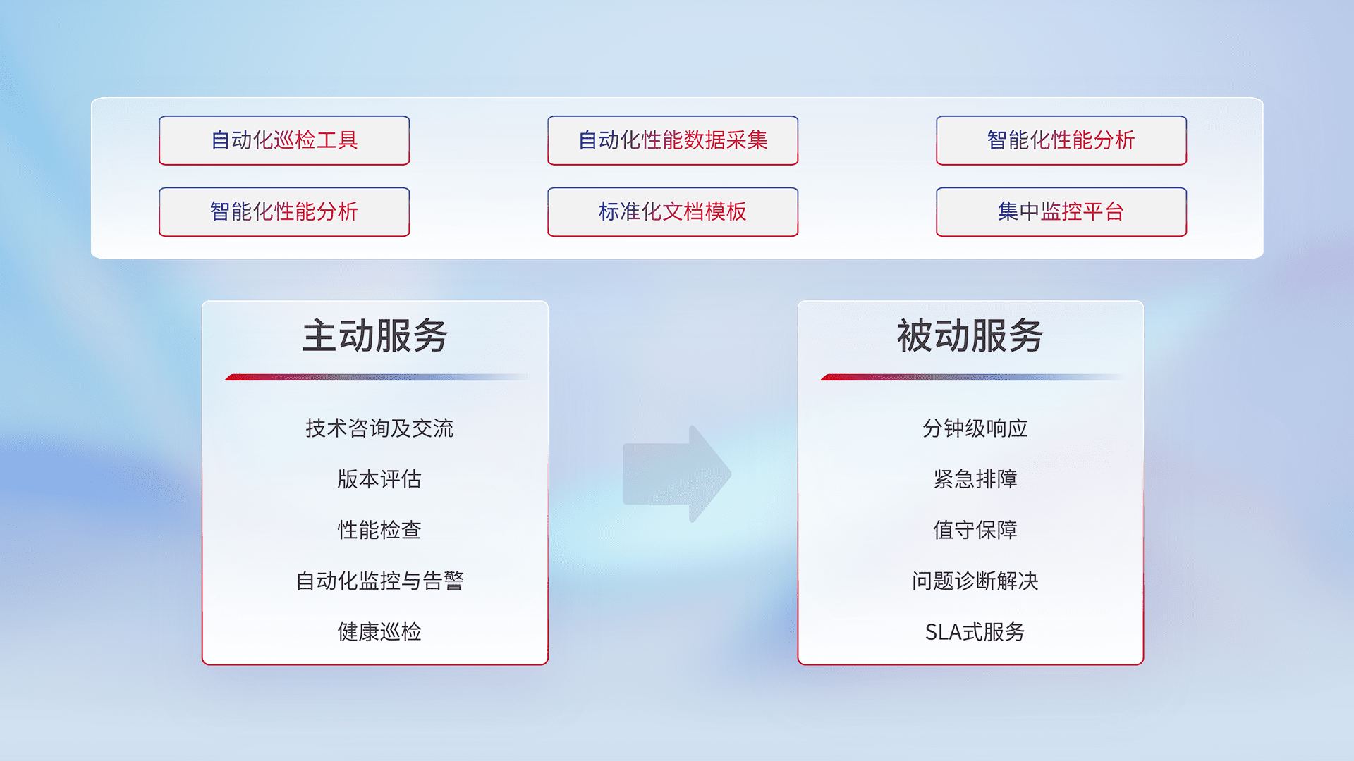 智能化工具和标准化文档,,,,保障服务质量,,,,提供主动服务(包含技术咨询、、、版本评估、、性能检查、、、、自动化监控与告警、、、、健康巡检)和被动服务包含(分钟级响应、、、紧急排障、、值守保障、、、问题诊断解决、、、SLA服务)。。。